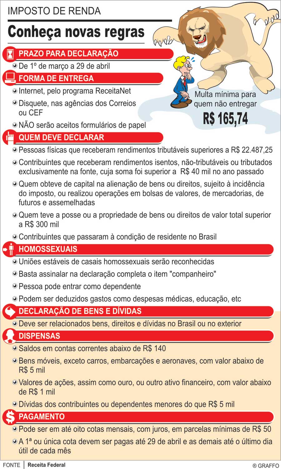 A Receita Federal divulgou novas regras para a declaração do imposto de renda de 2011, relativo ao ano de 2010. Como já anunciado anteriormente, a partir da declaração de renda de 2011 não será mais possível fazer a declaração para a Receita através de formulários de papel, agora os únicos meios aceitos são as declarações feitas pela internet e também as declarações apresentados em disquete. Outro anúncio da Receita Federal é que o limite para a isenção subiu, agora estão obrigados a prestar a declaração do IRPF 2011 aqueles que obtiveram rendimentos tributáveis de mais de R$ 22.487,25 (vinte e dois mil, quatrocentos e oitenta e sete reais e vinte e cinco centavos) em 2010, em 2010 eram obrigados a declarar aqueles que obtiveram rendimentos de mais de R$ 17.215,08 em 2009. Junto com as novas regras para a declaração, a Receita também divulgou oficialmente a data para início e término do envio das declarações, de 1º de março de 2011 a 29 de abril de 2011. O programa de computador para a declaração do Imposto de Renda 2011 deverá ser baixado da internet, através do site oficial da Receita Federal do Brasil. Como em todos os anos, a recomendação é não deixar a declaração do imposto de renda para ser feita em cima da hora. Agora que você já conhece as novas regras para a declaração do Imposto de Renda 2011, organize com calma a declaração do IRPF 2011 para não ter dores de cabeça no futuro.