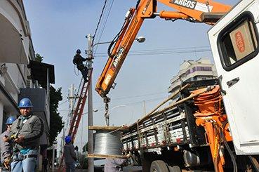 Oi trabalha para retirar fios do centro da Av. Venâncio Aires.