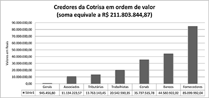 O liquidante Valdir da Silva Lima, entre outros dados, expôs que no período de 1º de janeiro até 5 de junho de 2014, a cooperativa já havia contabilizado um prejuízo de quase R$ 70 milhões, neste mesmo período, apurou uma receita bruta de pouco mais de R$ 16 milhões. Já o endividamento acumulado em sucessivos anos de prejuízos já ultrapassou os R$ 211 milhões. Conforme o balancete apresentado, o endividamento passou a demonstrar sinais de insustentabilidade já no ano de 2006. A dívida contraída, segundo expuseram nesta reunião os liquidantes tem como principais credores: fornecedores de insumos, Conab – Companhia Nacional de Abastecimento, bancos, entre outros, conforme o gráfico elaborado pela redação do O Mensageiro.