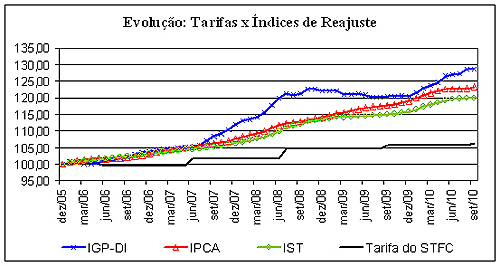 A tabela abaixo compara o percentual do reajuste com a variação de outros índices, incluindo o IGP-DI, que foi utilizado nos reajustes tarifários dos antigos contratos de concessão do STFC, entre 1998 e 2005.
