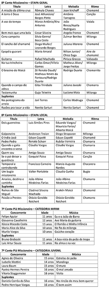 Já são conhecidas as 32 composições que serão apresentadas no 8º Canto Missioneiro da Música Nativa e no 7º Canto Piá Missioneiro de Santo Ângelo, que acontecem paralelamente entre 10 e 12 de setembro na Praça Pinheiro Machado.